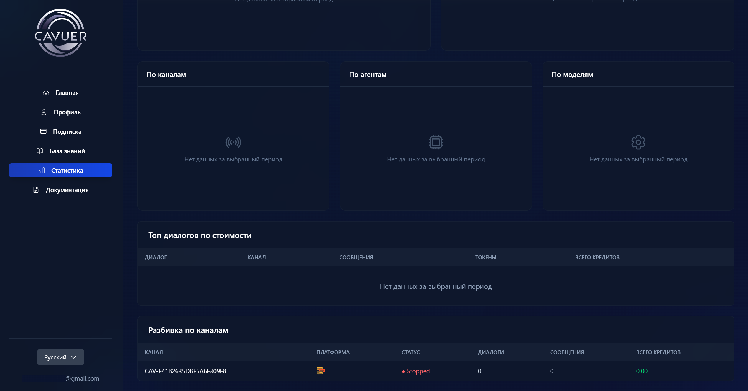 - Разбивка по каналам — статистика по каждому каналу: платформа, статус, диалоги, сообщения, кредиты