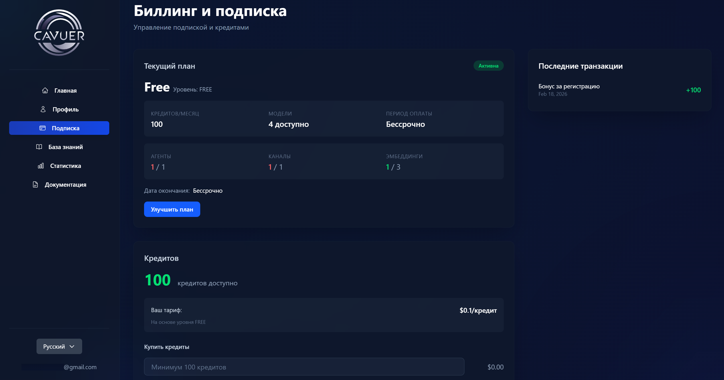 Кредиты — это внутренняя валюта сервиса Cavuer. Каждый ответ агента потребляет определённое количество кредитов в зависимости от модели. Кредиты также могут быть потрачены на вызов функций, обработку медиа и файлов, использование базы знаний и т.д.