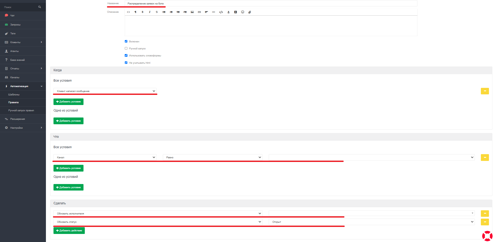 Добавьте дополнительные условия и действия по необходимости — например, назначение на конкретную группу агентов в зависимости от канала.