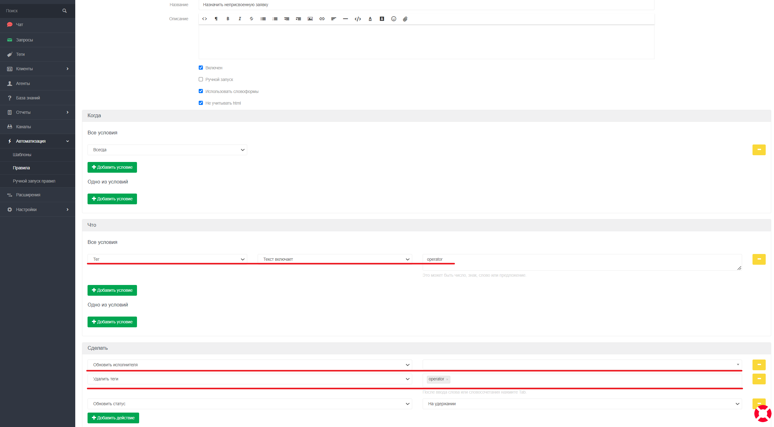 | Сделать | Обновить исполнителя → укажите необходимых агентов; Удалить теги → operator |