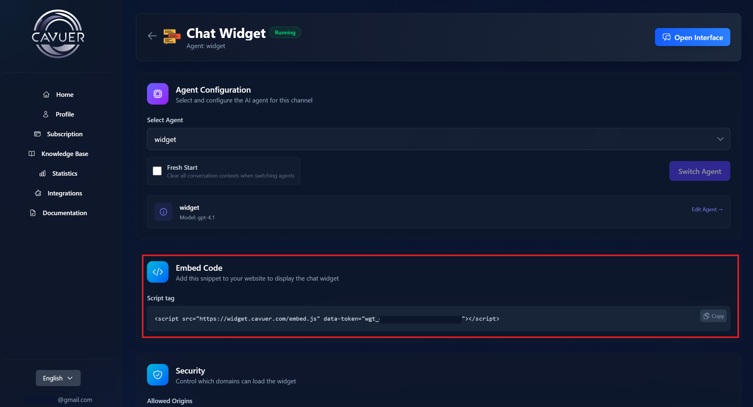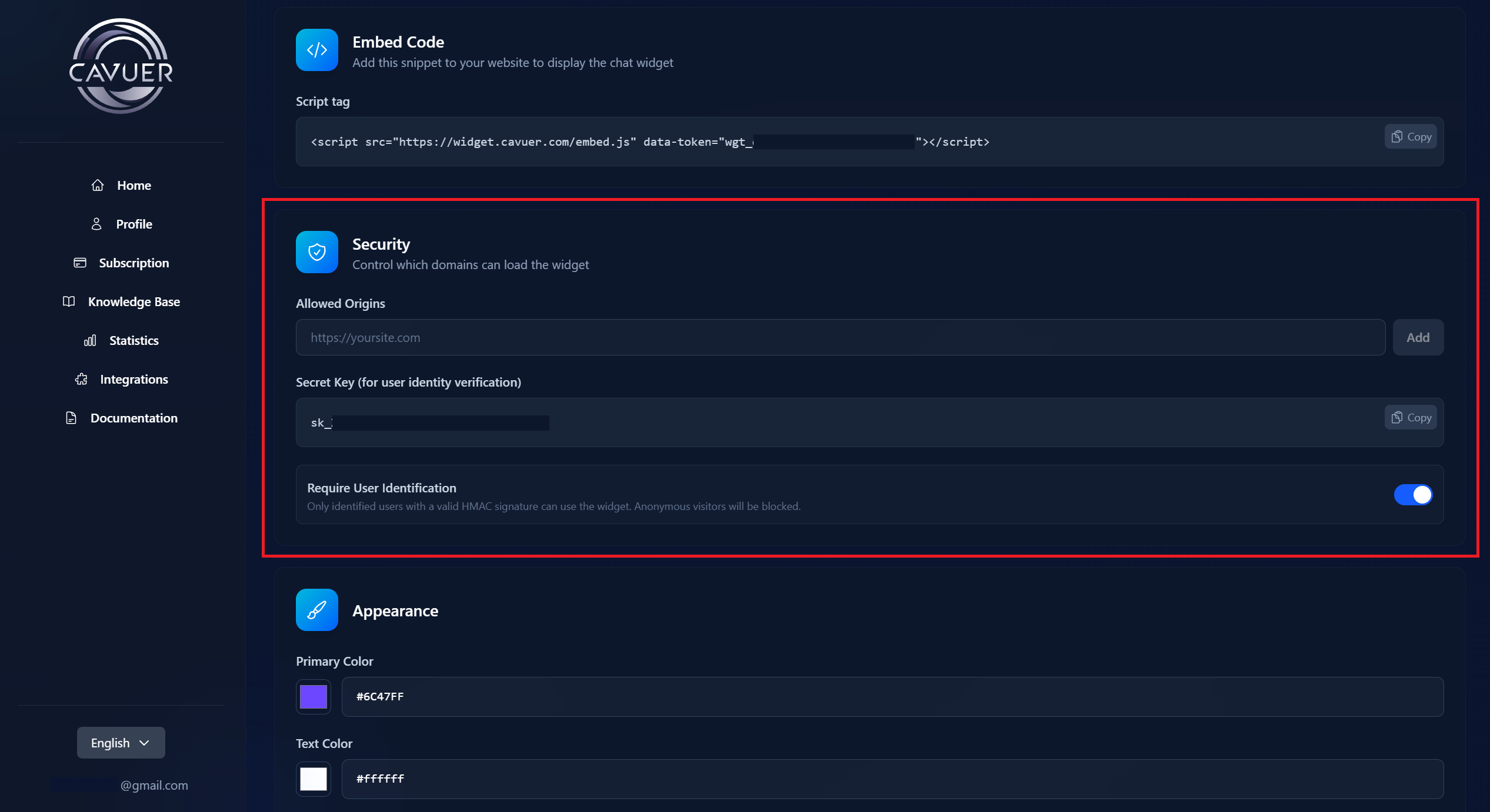 In the Cavuer dashboard, go to the Widget channel settings → Security and copy the Secret Key.